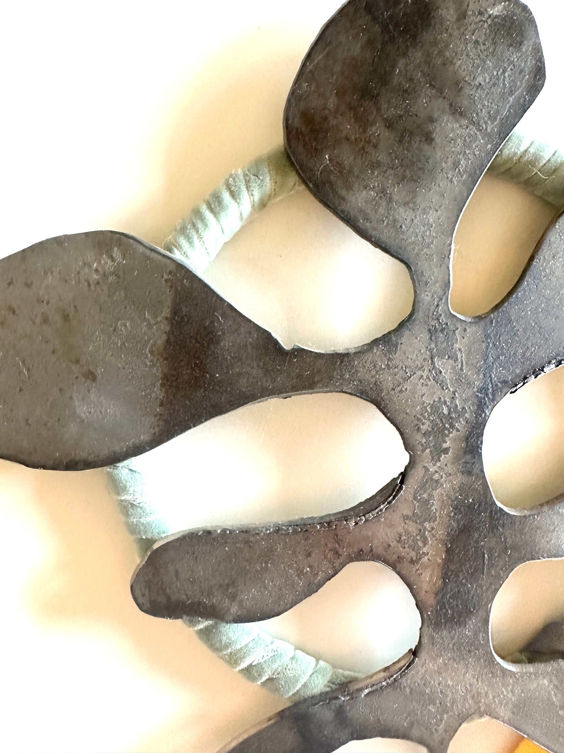 Recycled steel wrapped in sage-colored velvet.