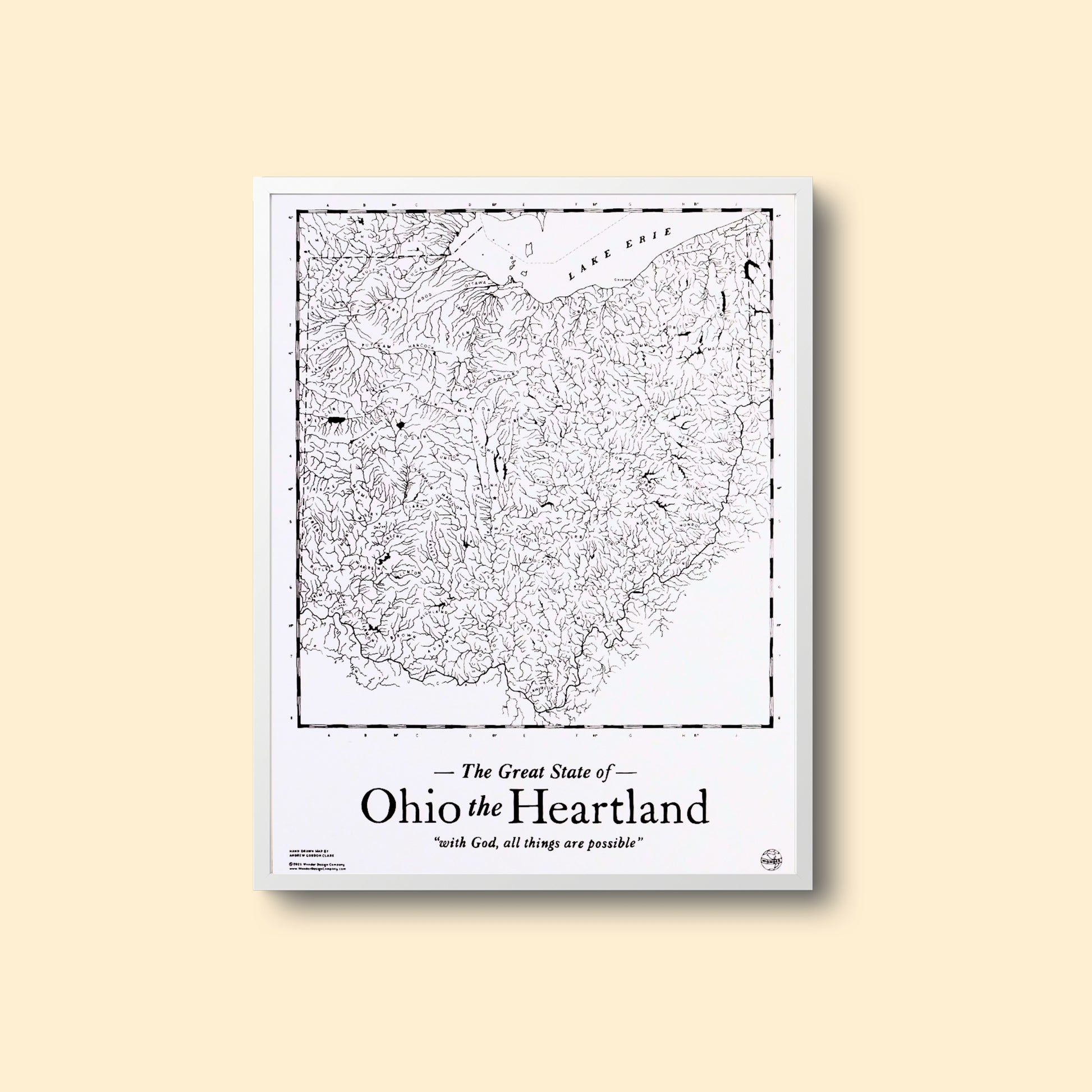 A hand-drawn map of the great state of Ohio by Andrew Gordon Clark. Screenprinted in Columbus, Ohio. Printed on 130 lb. Kraft-Tone French Paper. Includes all 88 counties in the state of Ohio.